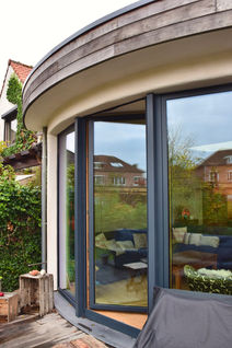 Voor deze woning in Heverlee werd het gelijkvloers grondig gerenoveerd, met bijzondere aandacht voor de achterbouw. Oorspronkelijk bestond de woning uit kleine, afgesloten ruimtes. Het ontwerp legt de nadruk op natuurlijke vormen, open, vloeiende ruimtes en een sterke connectie met de tuin. Zo werd de achterbouw vervangen door een gebogen gevel met veel ramen, en werden living en keuken visueel en functioneel tot één geheel gemaakt. Centraal in de ruimte prijkt een zorgvuldig gekozen boomstam die dienstdoet als kolom en een natuurlijke touch toevoegt.
